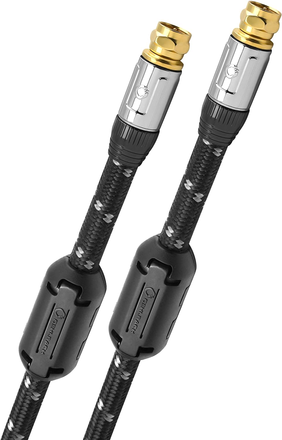 - 2 x massive Vollmetall-F-Stecker (gerade) und hochflexible robuste Gewebeummantelung; Koaxialer Aufbau; 5-fache Schirmung >125 dB; 75 Ohm Wellenwiderstand; 52pF/m Kapazität