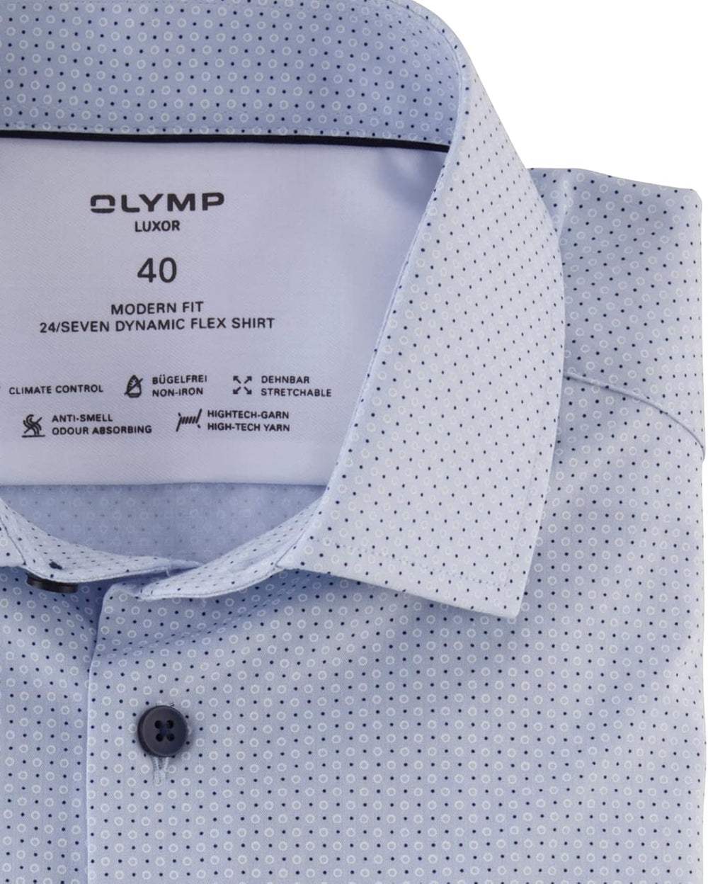 - OLYMP Luxor 24/Seven mirdern fit GREEN CHOICE Hemd Langarm Langarmhemd Herrenhemd Funktionshemd Ökohemd Biohemd Sommerhemd Temperaturregelndes Hemd Hemd gegen viel schwitzten kühlendes Hemd Muster hellblau