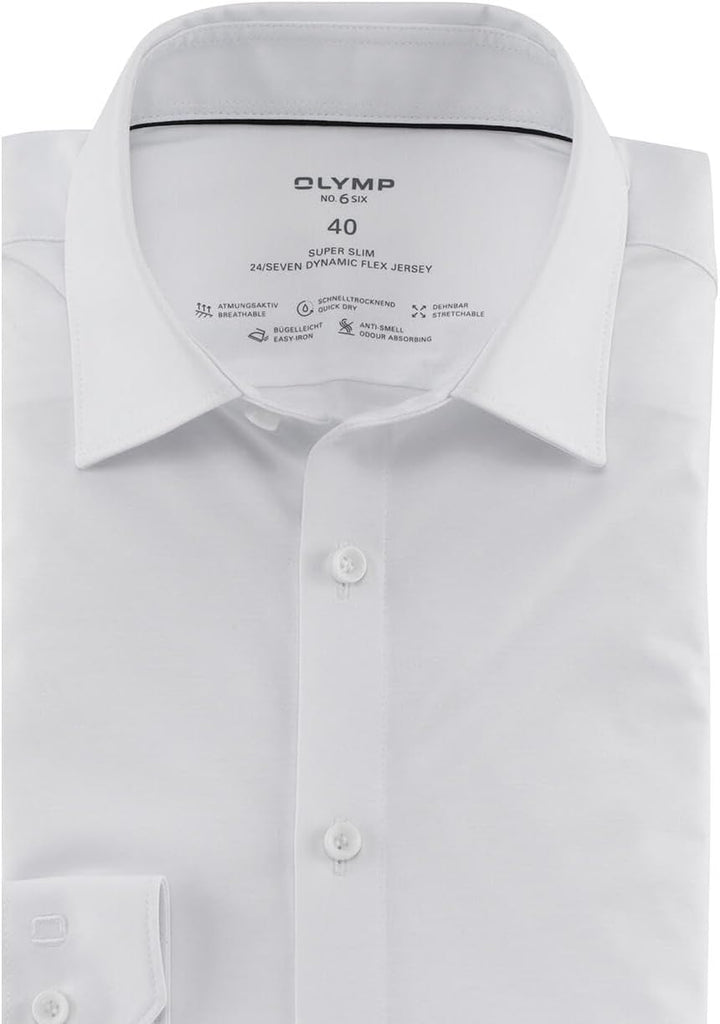 PRODUKTBESCHREIBUNGEN Dynamic Flex Jersey. Das OLYMP No. Six 24/Seven super slim Hemd ist ausgestattet mit einem modischen Muster, mit einem Haifischkragen und Kombimanschetten. Einen hohen Tragekomfort bieten die Stretch-Baumwolle-Qualität und der stark taillierte Schnitt. Kragenhöhe ca. 4 cm, Ärmellänge 67 cm