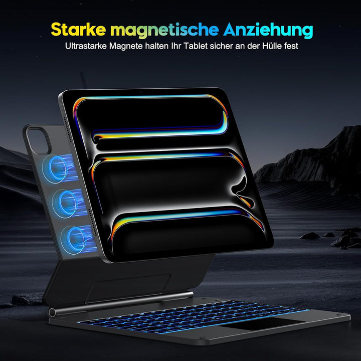 - FLOATING STAND DESIGN - Diese Tastatur Hülle für iPad Pro 13 Zoll M4 2024 ist mit einem schwebenden Ständer ausgestattet, der magnetisch am Gerät befestigt wird, so dass Sie den Betrachtungswinkel stufenlos an Ihre Bedürfnisse anpassen können