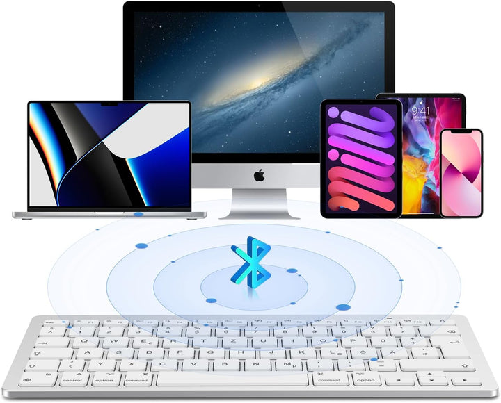 - 【Stabile Bluetooth Verbindung】 Das Tastatur und Maus Set hat eine solide Bluetooth-Verbindungsreichweite von bis zu 10 m. Die Tastatur mit Multimedia- und Hotkeys wurde speziell für Mac OS entwickelt, während die Maus mit mehreren Systemen wie Mac