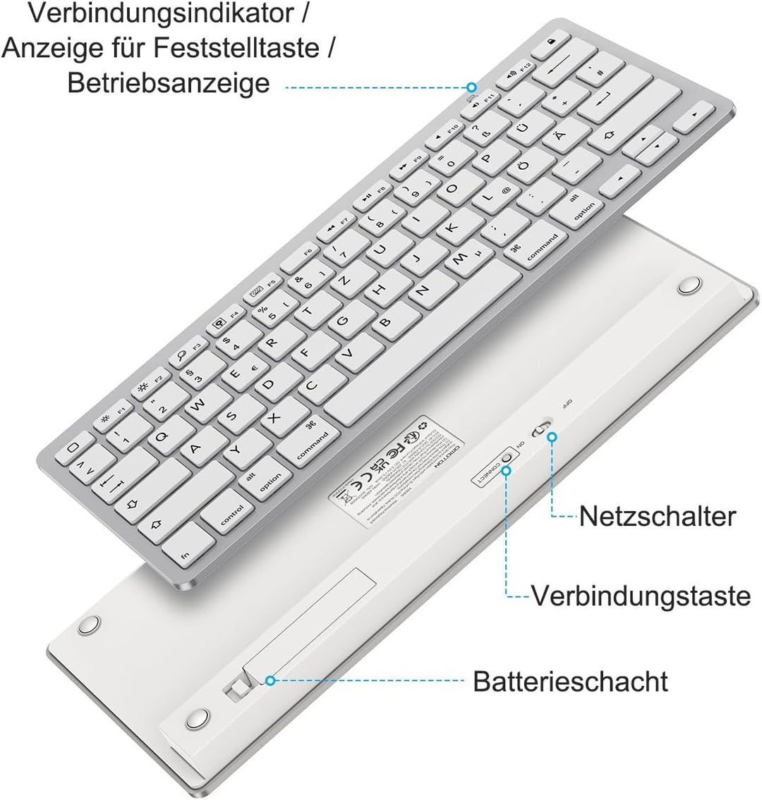 - 1. Kabellose Tastatur : Bluetooth Verbindung mit Gerät wie alles iPad Tablet und iPhone Handy, bietet deshalb mehr Komfort, wenn Sie tippen möchten. Die schnurlose Verbindung ermöglicht ein Arbeiten im gesamten Raum mit bis zu einer Entfernung von 10