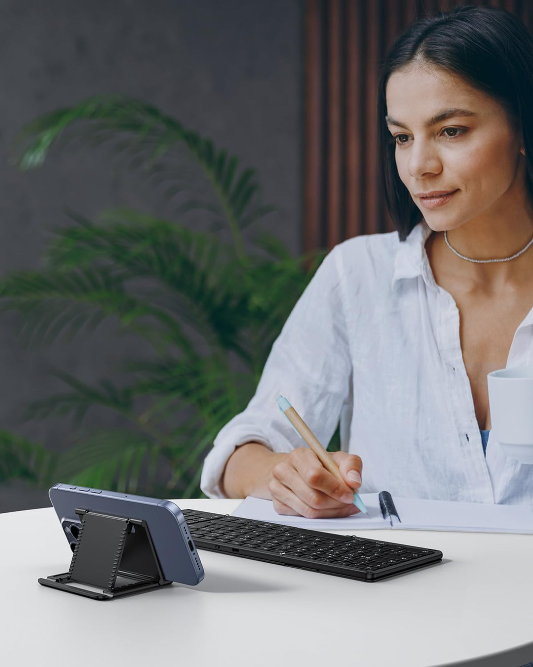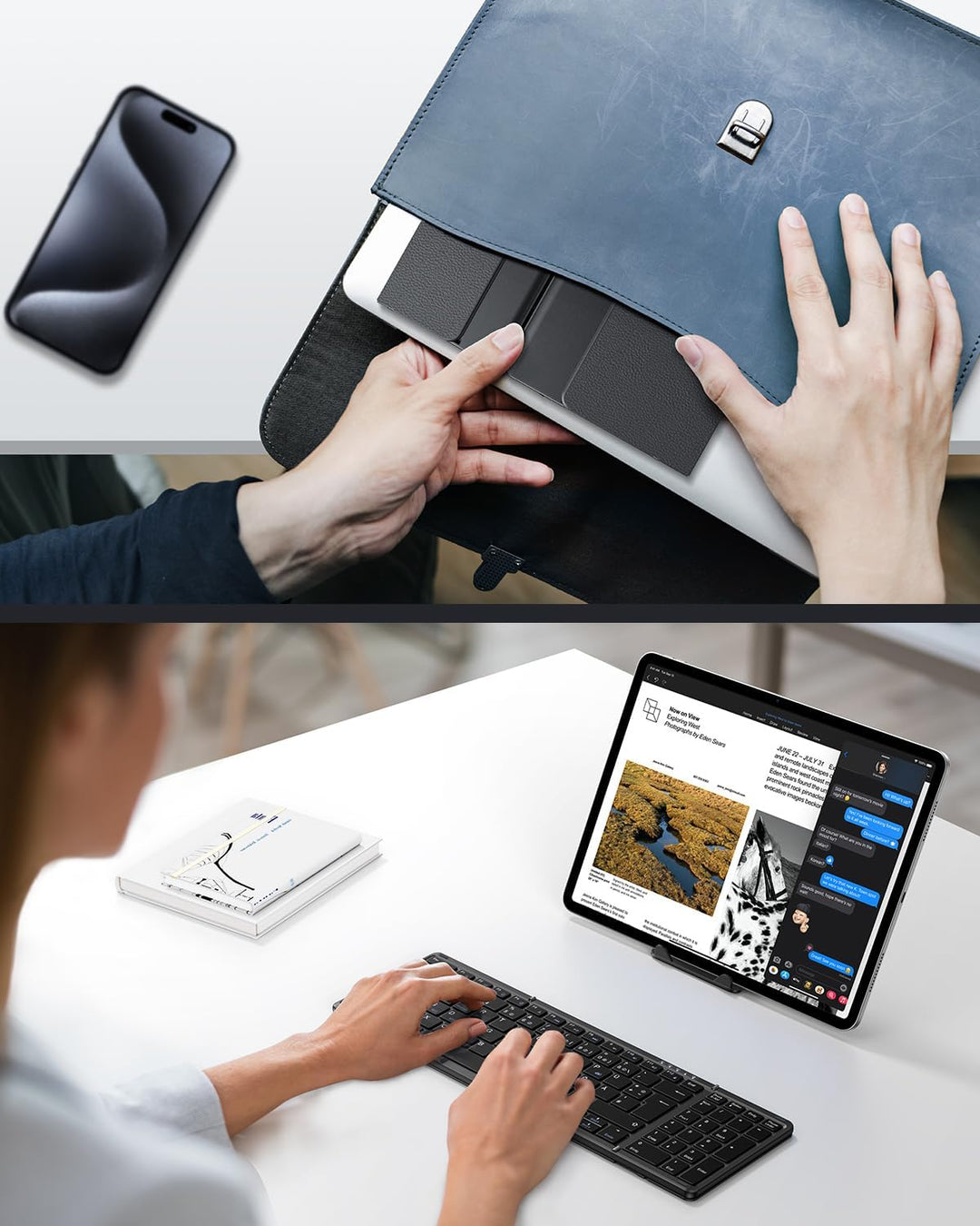 - Elegantes tragbares Keyboard: Wenn die klapptastatur gefaltet ist, hat sie die Grösse Ihres Telefons und passt leicht in Ihre Aktentasche, auch perfekt für die Verwendung in Flugzeugen, in der Bibliothek, in Cafés oder wo immer Sie wollen