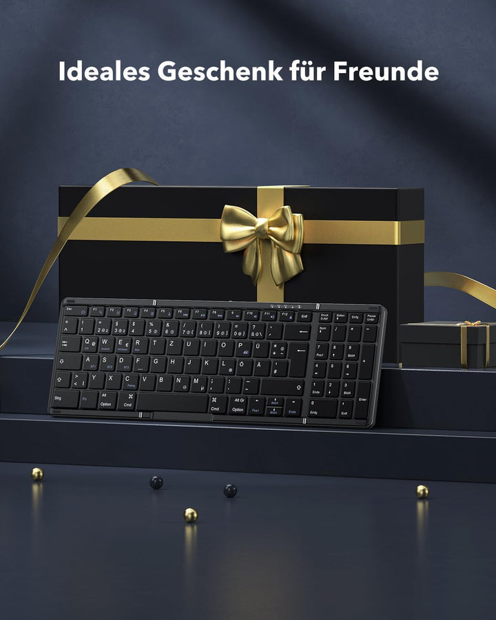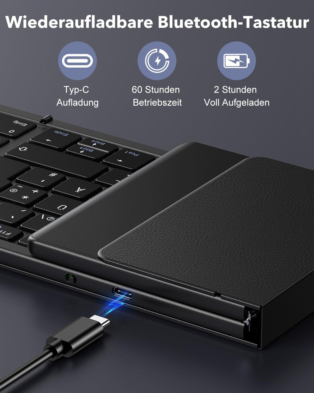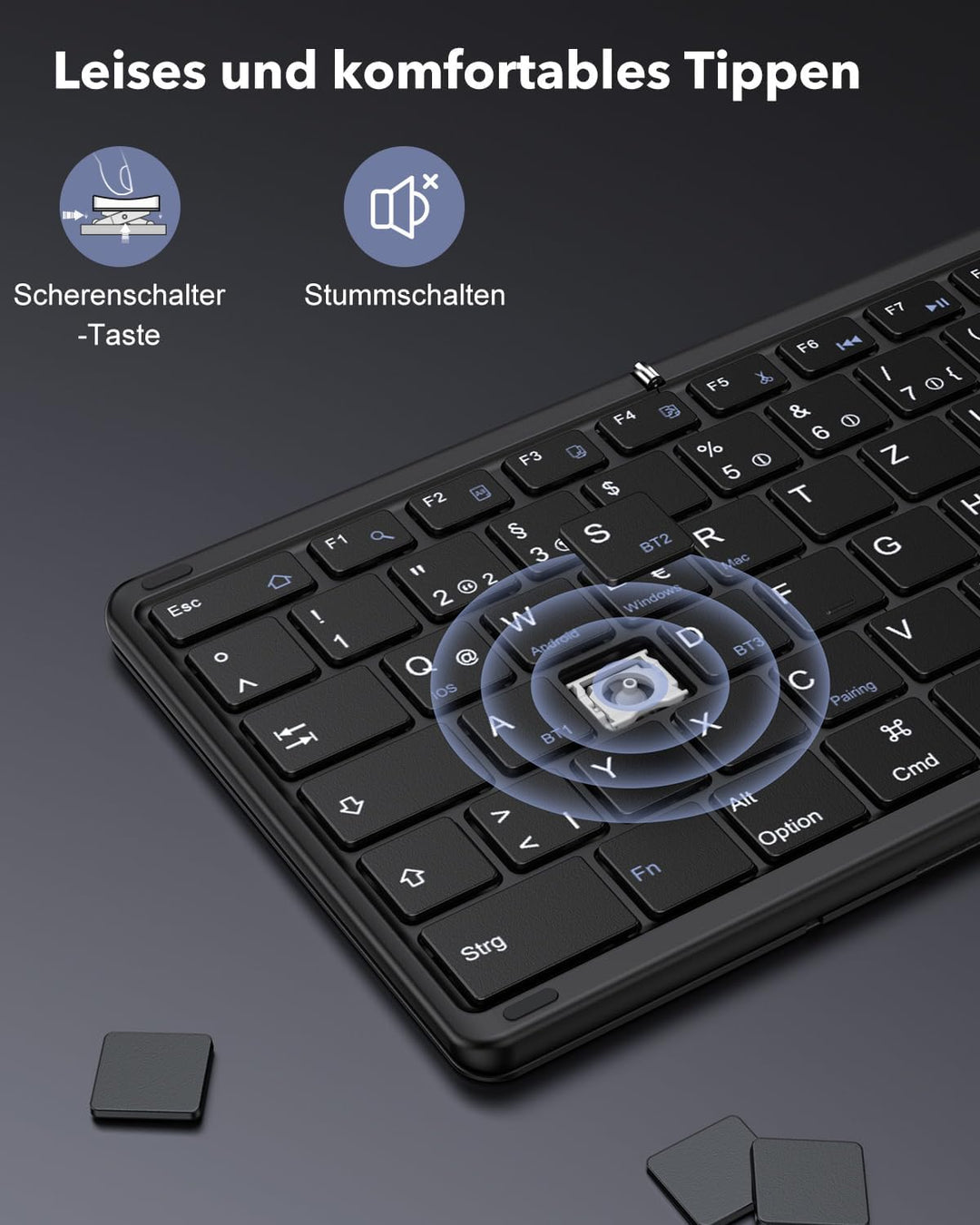 - Faltbare Tastatur mit Ziffernblock: Diese kabellose Tastatur ist eine Standardtastatur mit deutschem QWERTZ-Layout, Ziffernblock und einer Vielzahl von Tastenkombinationen, die Ihnen alle Tasten bieten, die Sie für effizientes Tippen benötigen