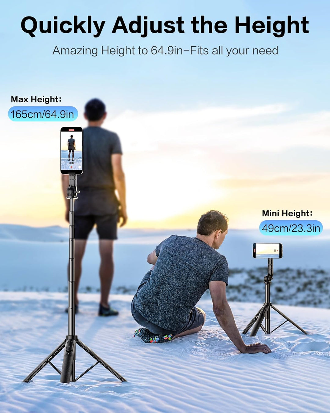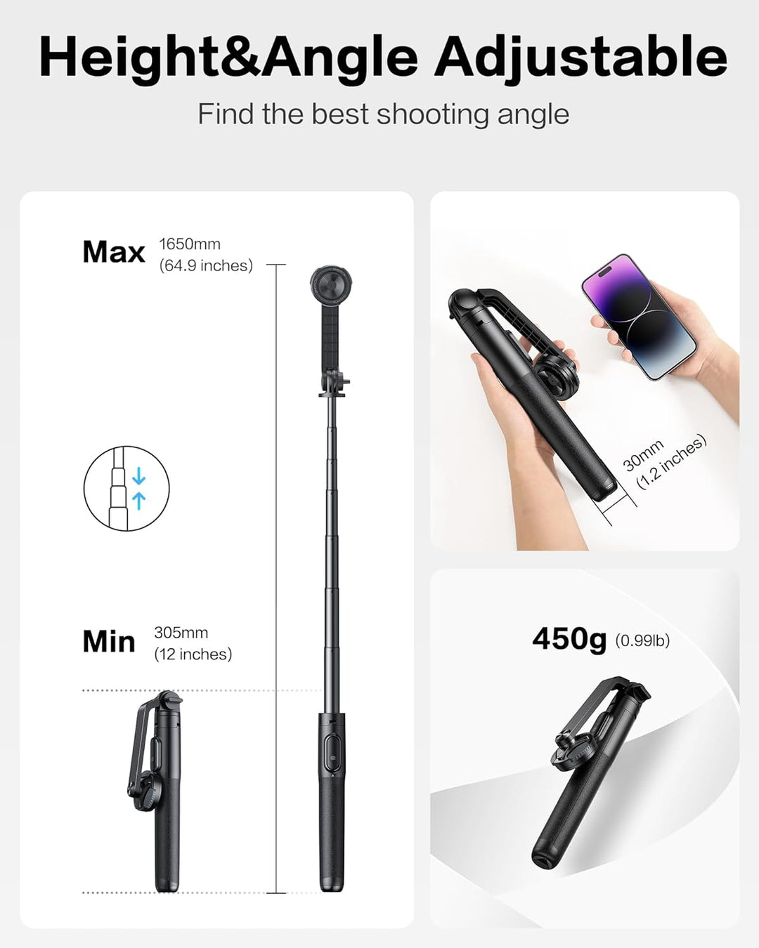 - 【64" Verstellbar】Das Smartphone Stativ kommt mit einer 7-teiligen verstellbaren Aluminium-Teleskopstange (von 12" bis 64" ). Durch 360° Drehung des Telefons und 190° Drehung des Haltearms können Fotos und Videos aus verschiedenen Winkeln