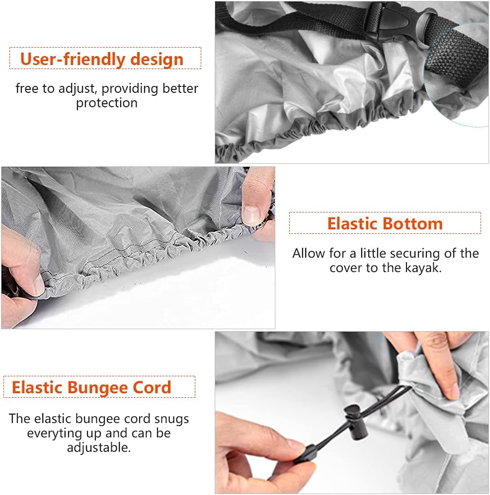 - Einfach zu bedienen: An der Rückseite der kajak persenning sind 3 Schnallenriemen angebracht, um die Bootsabdeckung fester am Kajak zu befestigen und zu verhindern, dass die Bootsabdeckung vom Wind weggeblasen wird und nicht leicht herunterfällt.