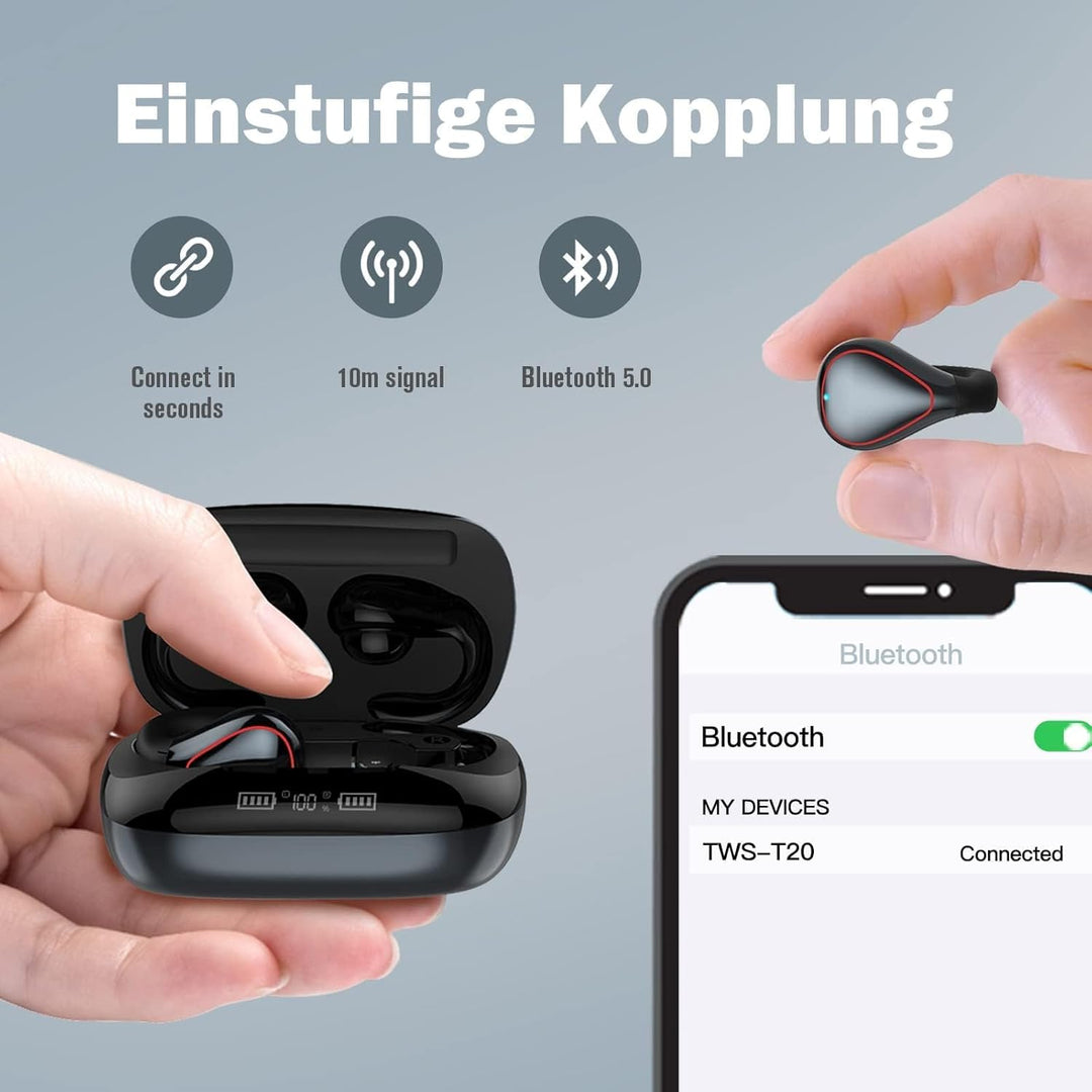 - 【LED-Leistungsanzeige und Touch-Steuerung】 Diese Wireless Ear Clip Bone Conduction Headphones ausgestattet mit einer einzigartigen intelligenten digitalen LED anzeige, zeigt genau die verbleibende Leistung in digitalem Format. Der Ladekoffer