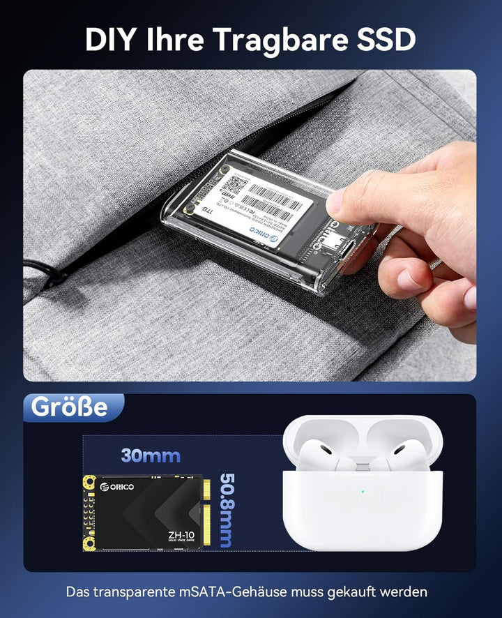 - Eine tragbare SSD zum Selbermachen: Kombinieren Sie die msata SSD mit dem transparenten ORICO mSATA-Festplattengehäuse (TC10), um eine kompakte und elegante PSSD zu erstellen. Bauen Sie Ihre eigene mobile Datenbank