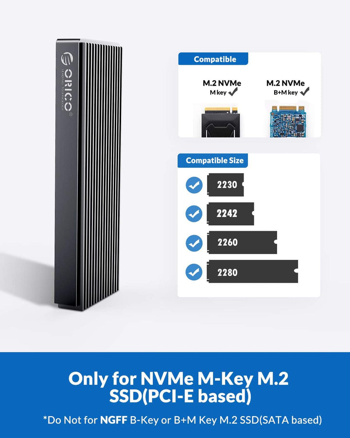 - 【Anwendbare SSD】 Dieses M.2 SSD-Gehäuse ist kompatibel mit M.2 NVMe M-Key / B+M Key(basierend auf PCI-E) 2230, 2242, 2260, 2280. Es unterstützt keine M.2 SATA-basierte SSD, M. 2 PCIe AHCI-Solid-State-Laufwerke, M.2-SSD von Mac, mSATA-SSD und Nicht-M.2-Formfaktor-SSDs. Voll kompatibel mit Windows / Mac / Linux-Betriebssystemen für mehrere Plattformen. Geeigneter Speicher ist bis zu 2 TB.
