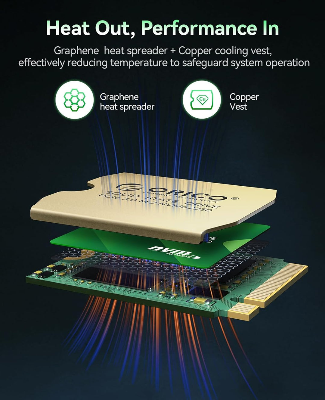 - Effektive Wärmeableitung: Ausgestattet mit einem Kupferkühlkörper und einem Graphen-Wärmeableiter sorgt diese SSD NVMe für eine effiziente Wärmeableitung und verhindert eine Überhitzung bei intensiver Nutzung. Sie sorgt für eine stabile Leistung