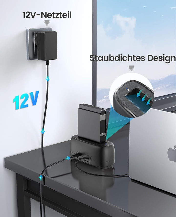 - 【Schnelles Lesen & Schreiben】Unsere 1-fach festplatten dockingstation unterstützt das schnelle UASP Übertragungsprotokoll und ermöglicht dank USB Typ-C Port eine Übertragungsrate von bis zu 5Gbps. Die 12V/2A Stromversorgung garantiert einen