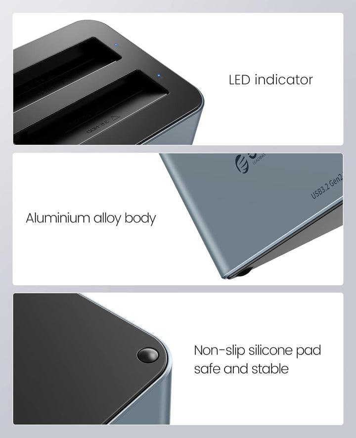 - 【High-End-Aluminiumlegierungsmaterial】ORICO besteht aus robustem und langlebigem Aluminiumlegierungsmaterial mit vertikalem Design, das eine hohe Leistung und schnelle Wärmeableitung bietet. Die staubdichte Steckdosenblende hält die Dockstation