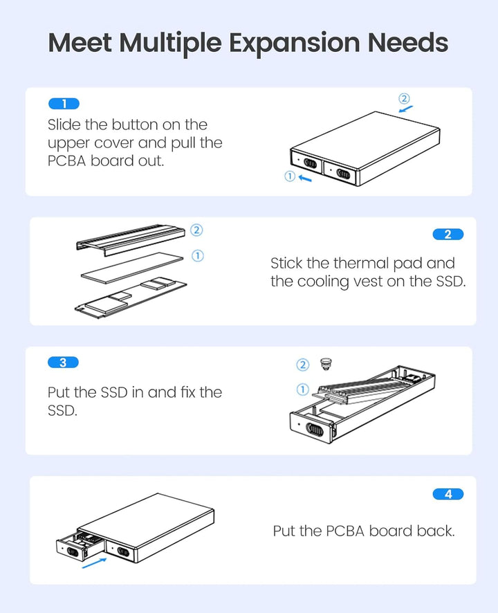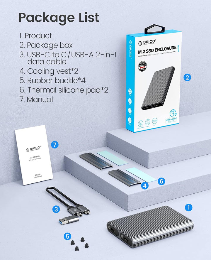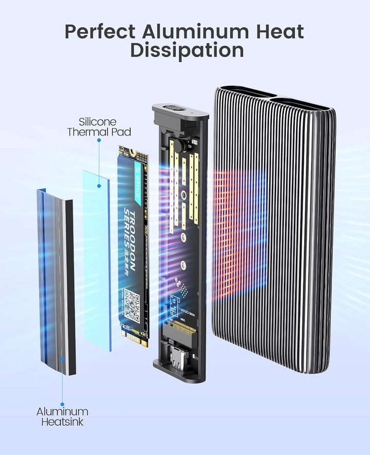 - Wärmeableitung Komplett aus Aluminium: Das ORICO M.2 NVMe SATA-Gehäuse verwendet ein gestreiftes Rippendesign aus Aluminiumlegierung, um den Wärmeableitungsbereich zu erweitern, mit zwei Wärmeableitungswesten (Kühlkörpern) und zwei