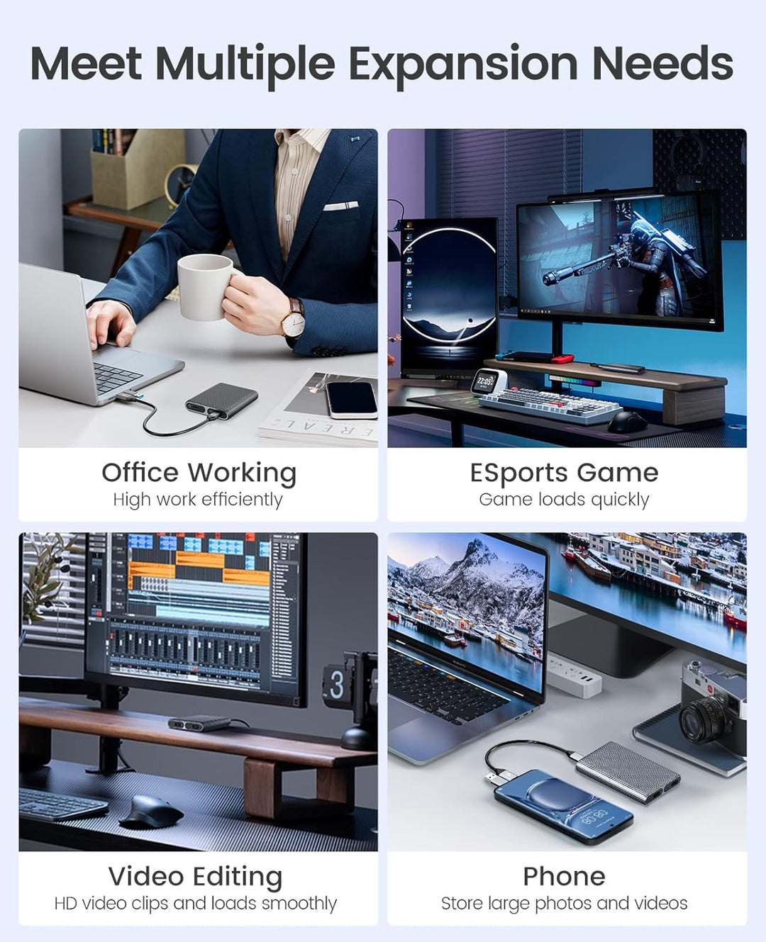 - Duales NVMe- und SATA-Gehäuse: Dieser M.2-Adapter mit zwei Steckplätzen verfügt über zwei unabhängige M.2-SSD-Gehäuse für M.2-NVMe und SATA-SSD, führt eine einzelne SSD unabhängig voneinander aus und verbindet zwei Datenkabel gleichzeitig, um