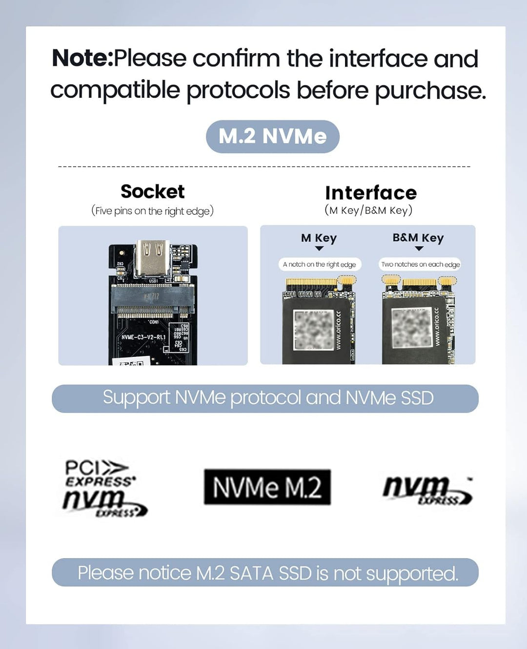 - 【Kompatible SSD】 Das ORICO M.2 SSD-Gehäuse ist kompatibel mit M.2 PCIe NVMe M-Key SSD oder NVMe M+B Key SSD, SSD-Grösse ist 2230/2242/2260/2280. Der NVME-USB-Adapter unterstützt Windows-, Mac OS- und Linux-Systeme. Plug and Play, keine