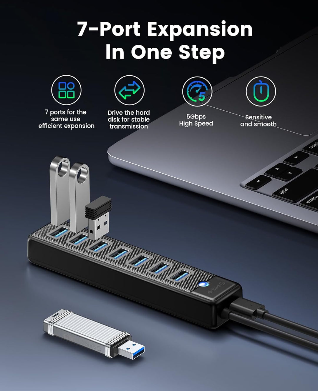 - 【Superschnelle Übertragung】Der 7 Port USB HUB 3.0 kann mehrere Geräte gleichzeitig lesen, unterstützt bis zu 5Gbps USB3.2 Gen1 Übertragungsprotokoll, und überträgt 1G Dateien in 3 Sekunden, 10 mal schneller als USB2.0, Verbesserung Ihrer