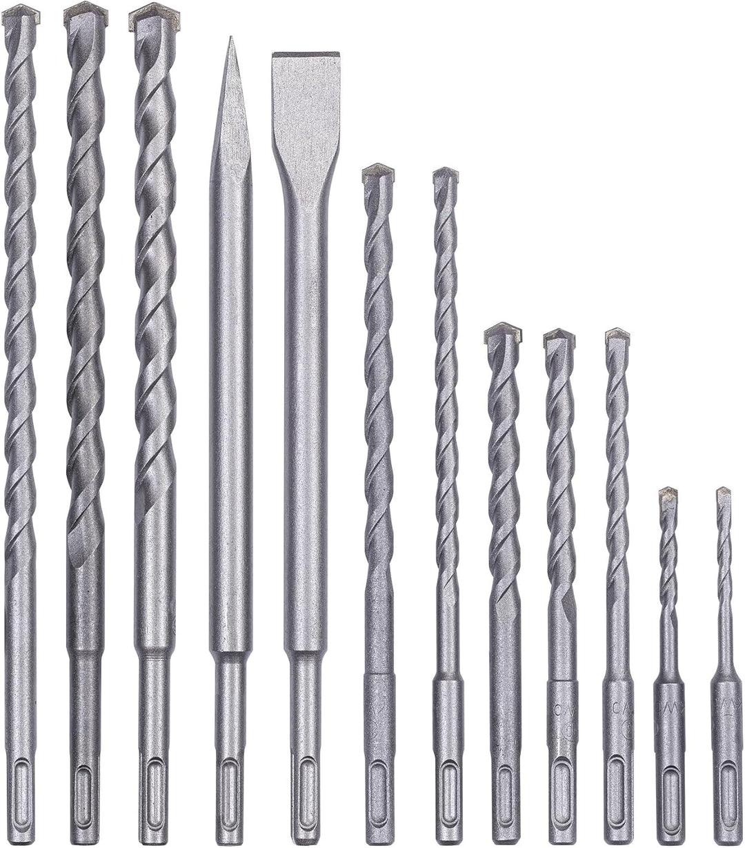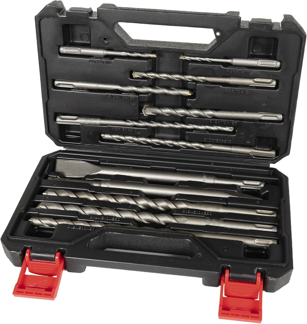 - Bohrer – Kraftvolles Bohren in Beton oder Mauerwerk ermöglichen die 10 Bohrer: 2x 60 mm (Ø 5, 6 mm), 3x 110 mm (Ø 8, 10, 12 mm), 2x 160 mm (Ø 8, 10 mm), 3x 210 mm (Ø 12, 14, 16 mm).
