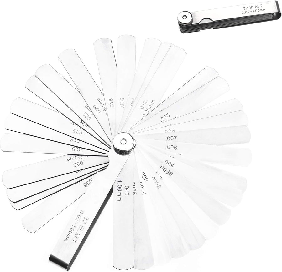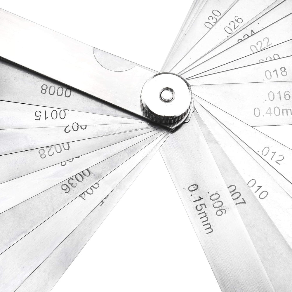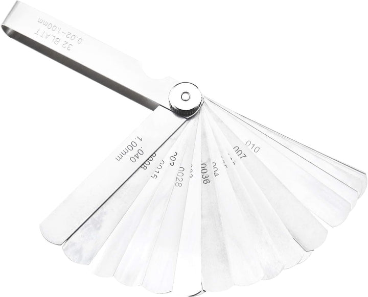- Zweifache Markierung: 0,02 mm (0,0008 Zoll) bis 1 mm (0,40 Zoll). Die Zahlen sind zur leichten Erkennung in die Fühlerlehre eingeätzt.