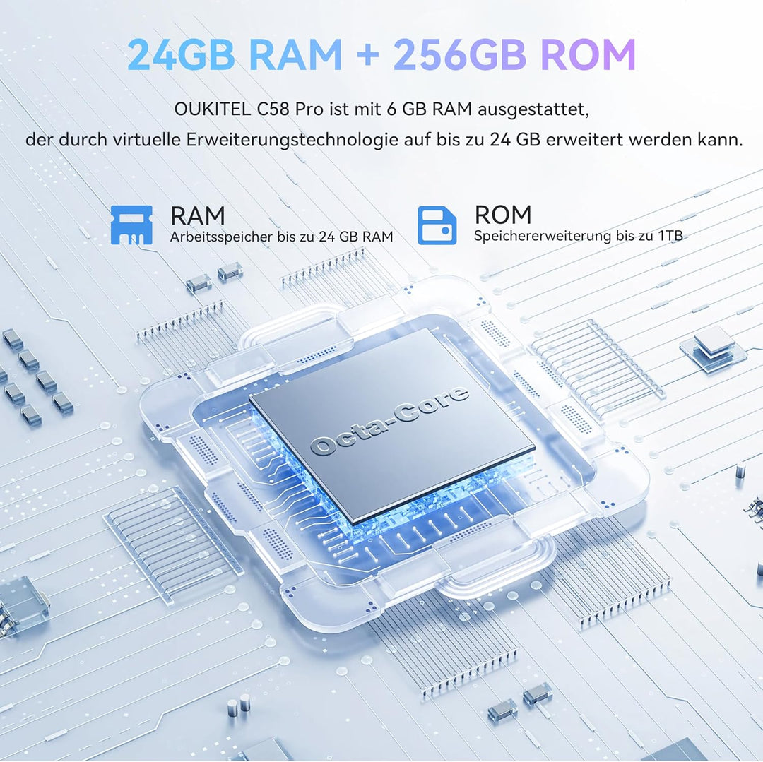 - 【24 GB RAM + 256 GB ROM- und Octa-Core-Prozessor】 Dank der Speicherausdehnungstechnologie erhöht das C58 Pro Android smartphone ohne vertrag den RAM von 6 GB auf eine virtuelle 24 GB und verbessert die Ausführungsgeschwindigkeit um 50 Prozent.