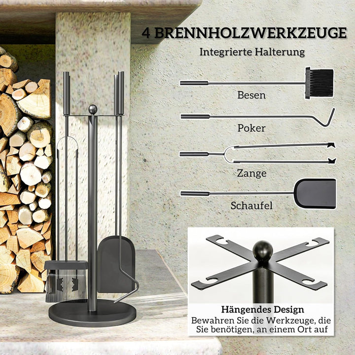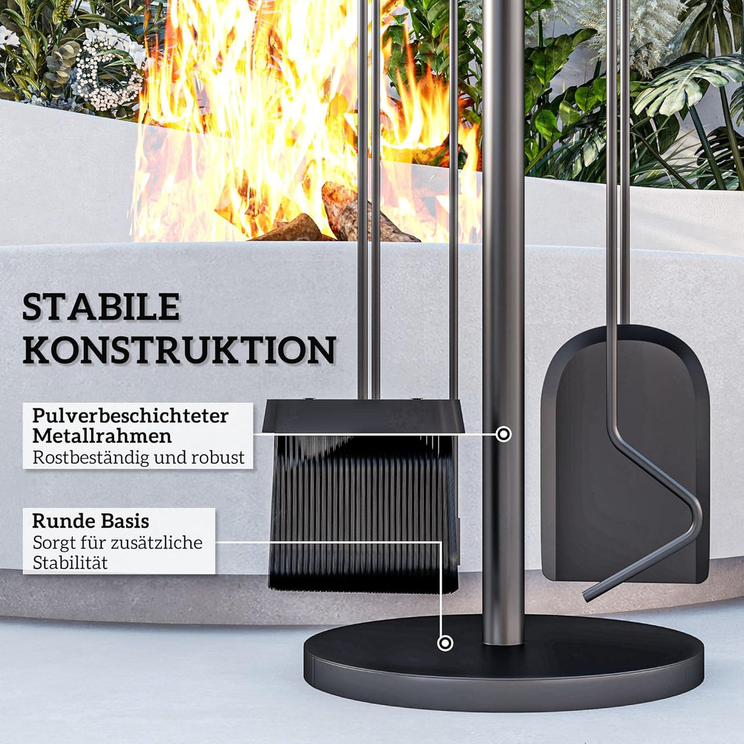 - Praktisches 5-teilige Set: Dieses Kaminbesteck Set umfasst Besen, Schaufel, Zange, Schürhaken und einen stabilen Ständer. Die vier Halterungen sorgen für Ordnung und Übersichtlichkeit, während der runde Sockel für hervorragende Stabilität sorgt