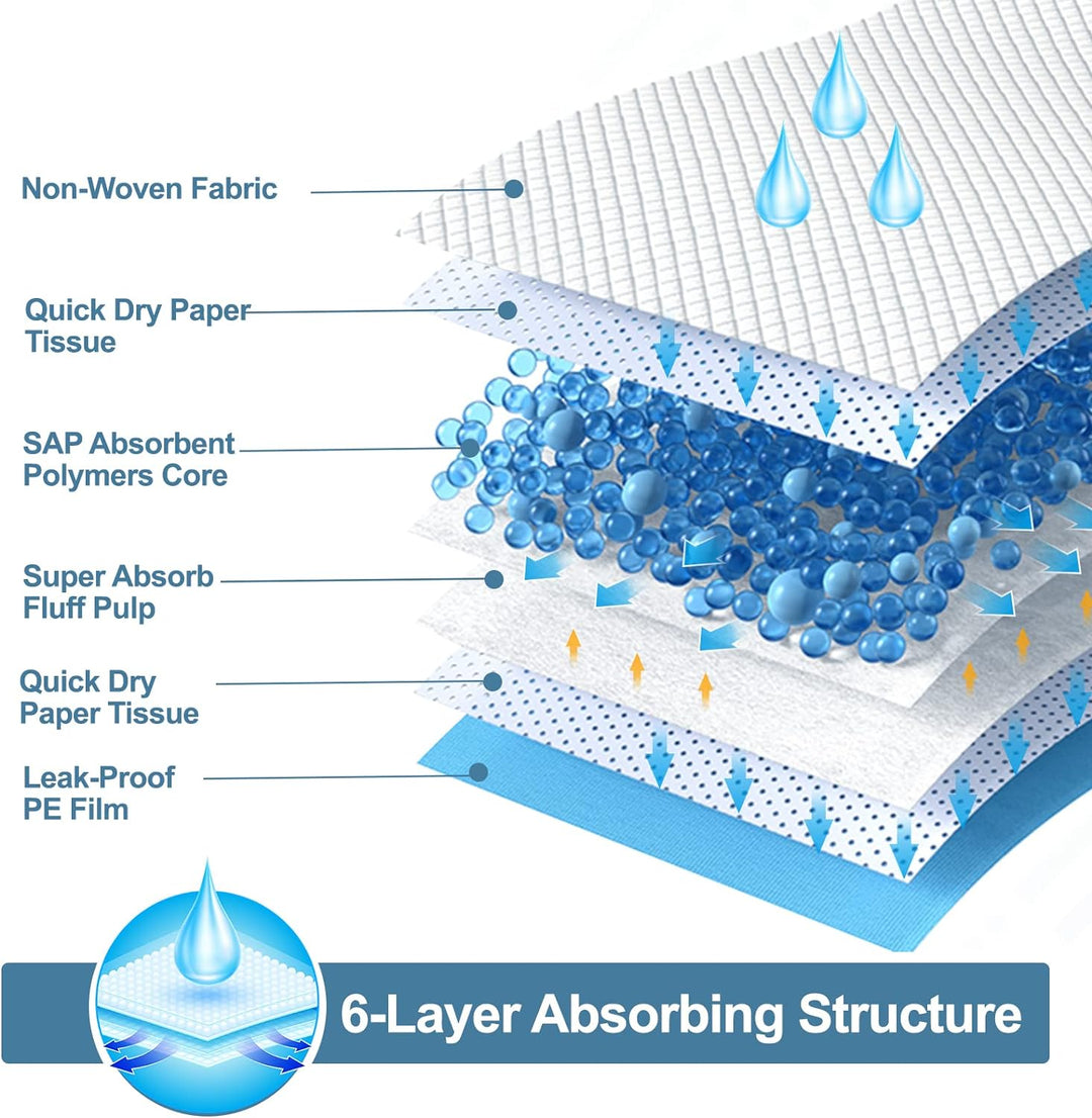 - 【6-lagiges leckdichtes Design】: Die Vliesstoff-Oberfläche ist mit einem Rautensteppmuster versehen, das den Flüssigkeitsfluss lenkt, während die Polymer-Baumwollkernschicht die Flüssigkeit sofort in ein Gel umwandelt. Die letzten zwei Schichten