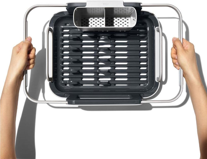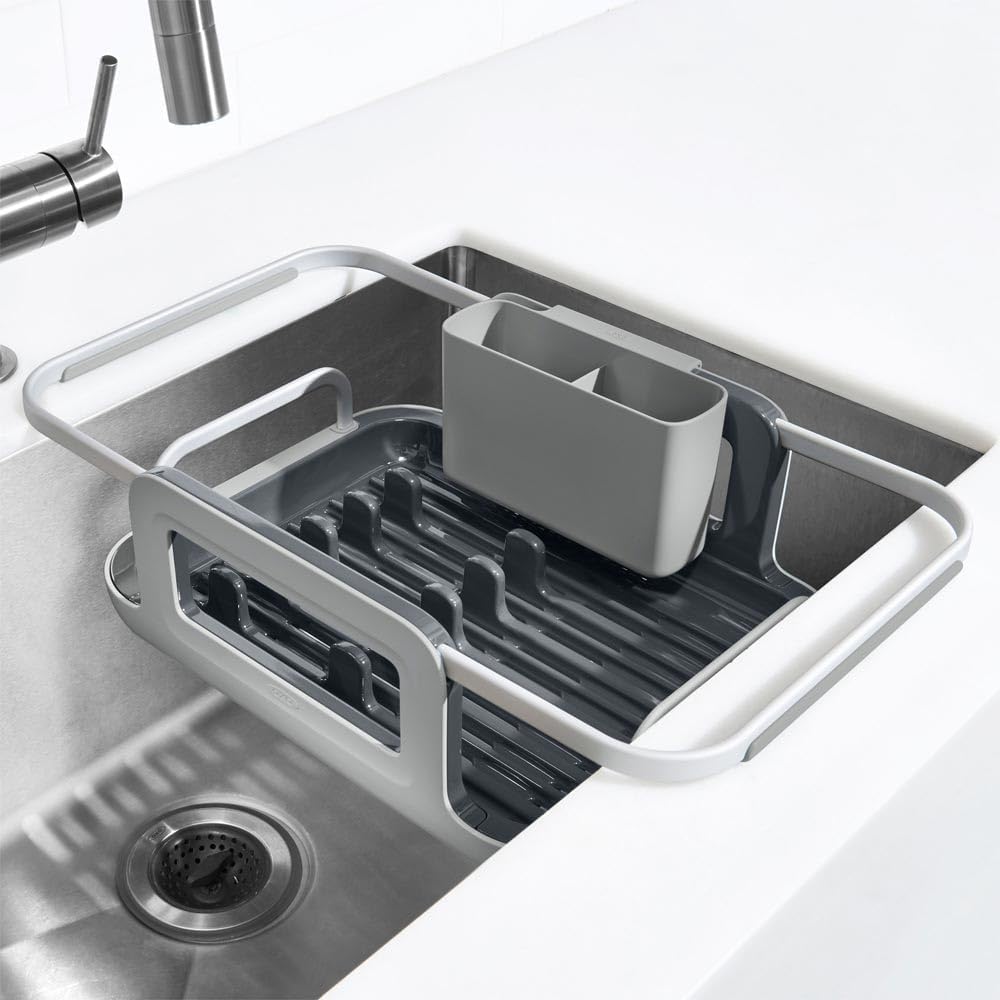 - Die ausziehbaren Arme passen sich an verschiedene Spülbeckengrössen an oder lassen sich für eine kompakte Aufbewahrung zurückziehen