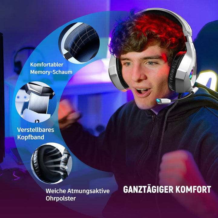 - 【3D Surround Sound】Dieses Gaming-Headset verfügt über eine hervorragende Geräuschunterdrückung und hochpräzise 50mm Magnet Neodym Treiber für kristallklaren Sound und ein komfortables Hörerlebnis, das ein lebendiges Klangfeld bietet. Mit