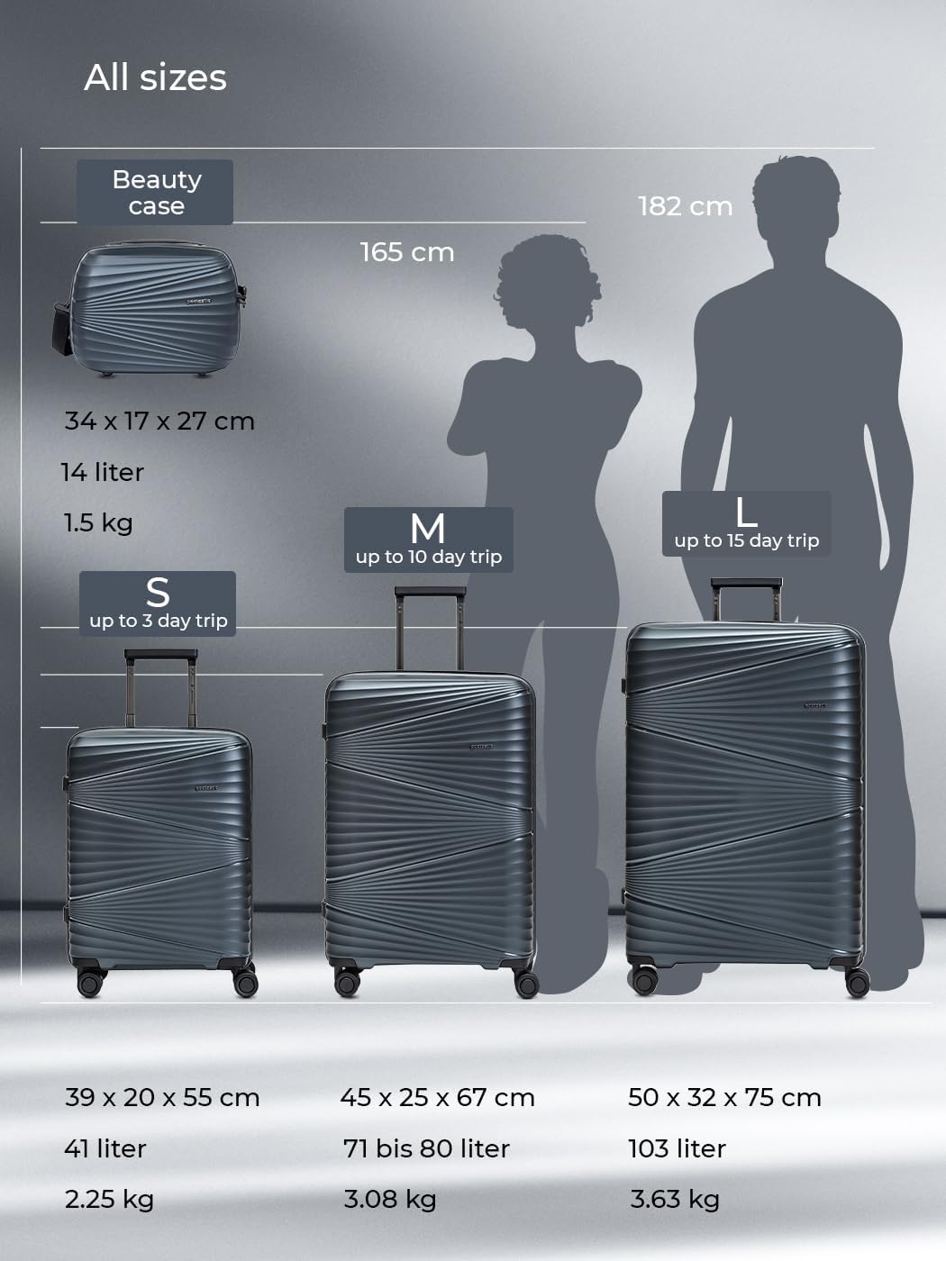- VIEL PLATZ: Der grosse Koffer bietet mit seinen 50 x 32 x 75 cm (LxBxH), einem Gewicht von 3,63 kg und einem Volumen von 103 Liter viel Stauraum für ausgiebige Reisen. Der mittelgrosse Koffer misst 45 x 25 x 67 cm, ein Gewicht von 3,08 kg und ein