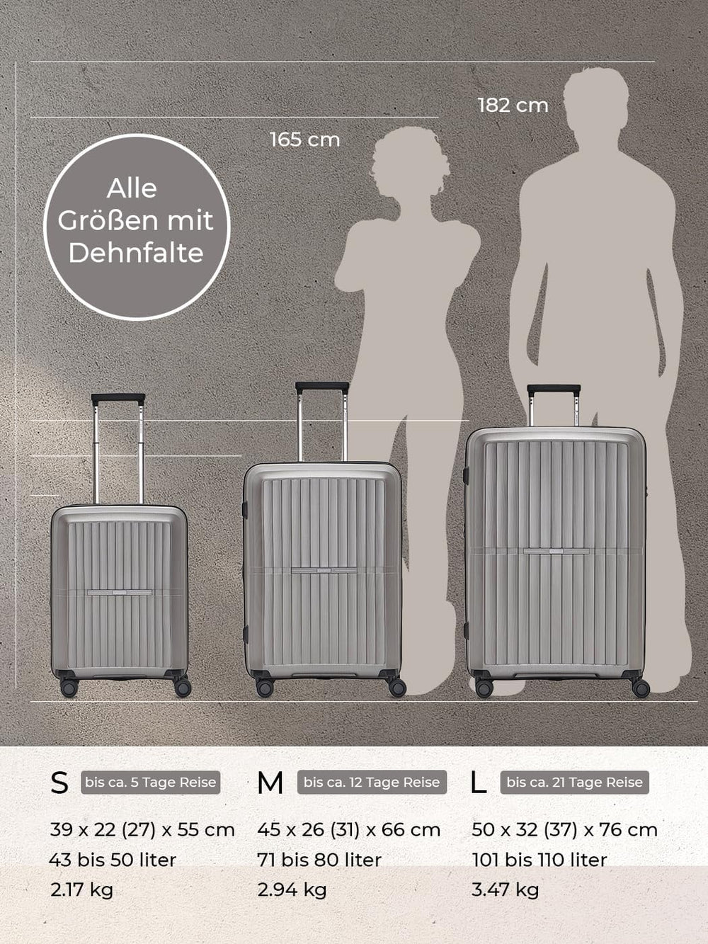 - VIEL PLATZ: Der grosse Koffer bietet mit seinen 50 x 32 x 76 cm (LxBxH), einem Gewicht von 3,47 kg und einem Volumen von 101 - 110 Liter viel Stauraum für ausgiebige Reisen. Der mittelgrosse Koffer misst 45 x 26 x 67 cm, ein Gewicht von 2,94 kg und ein