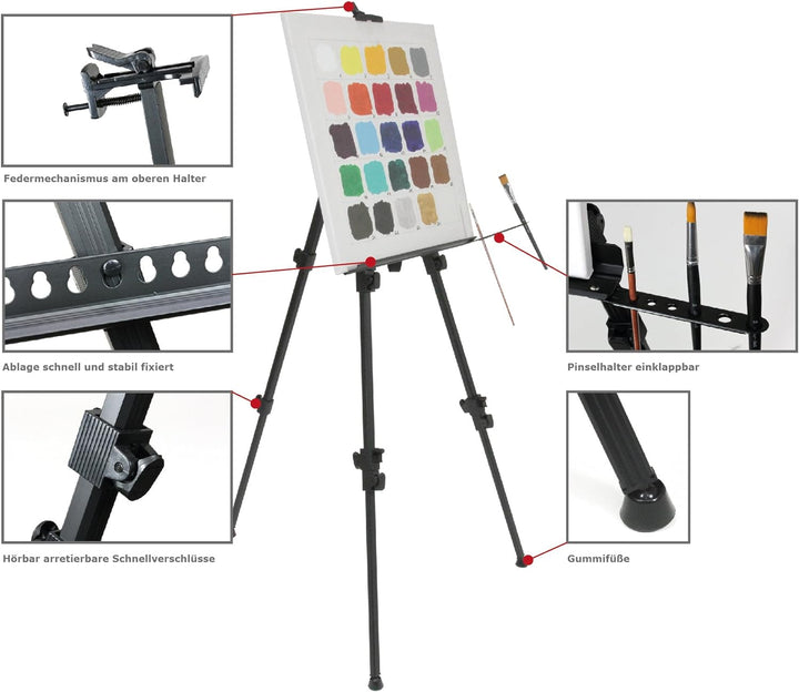 - STABIL: Hochfestes Aluminium mit solider Wandstärke - nur wenige Gramm schwerer aber deutlich robuster und standfester: Hohe Tragkraft bis 8 kg. Sicherer Stand durch bewegliche Gummifüsse, die sich dem Untergrund und dem Malwinkel flexibel angleichen.