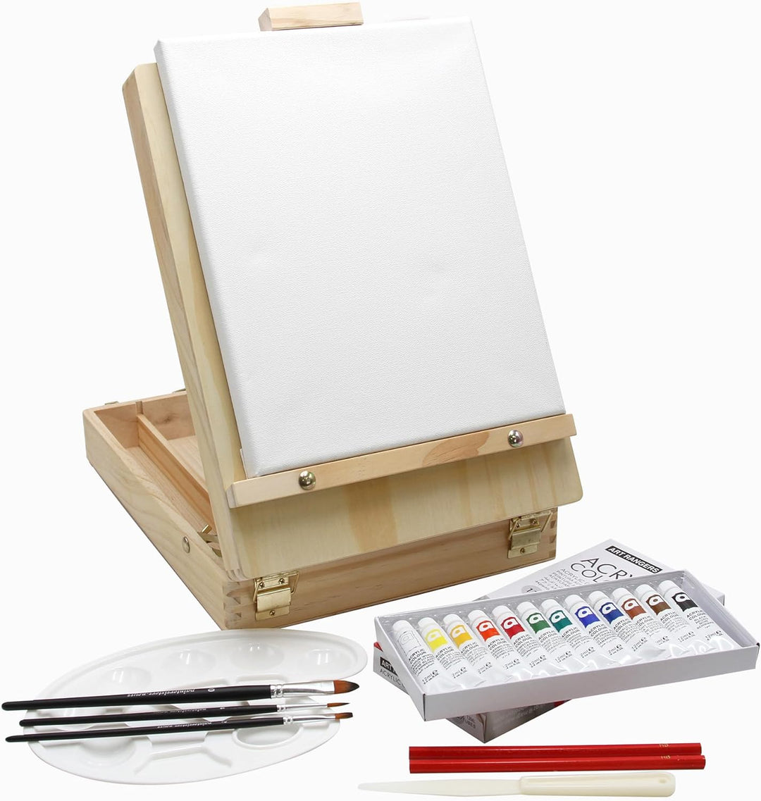 - ✔ LIEFERUMFANG: Sie erhalten eine grosse Koffer-/Tischstaffelei (Masse ca. 45 x 33 x 13cm), 18 Tuben je 12 ml feine Studio-Acrylfarbe in perfekter Zusammenstellung, grosse Mischpalette aus abwaschbarem Kunststoff (23x17cm), 5-teiliges Meister-Soft Pinselset in Katzenzungen (Gr. 0, 2, 4, 8 + 12), Keilrahmen (25x30cm + 30x40cm) inkl. 16 Keile zum Nachspannen, ein Kunststoff-Palettmesser und 2 Skizzen-Bleistifte.