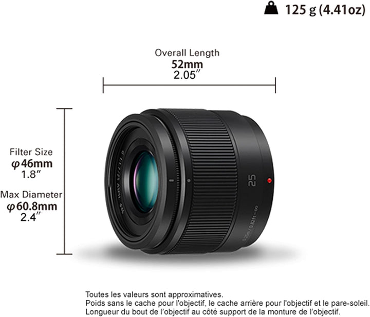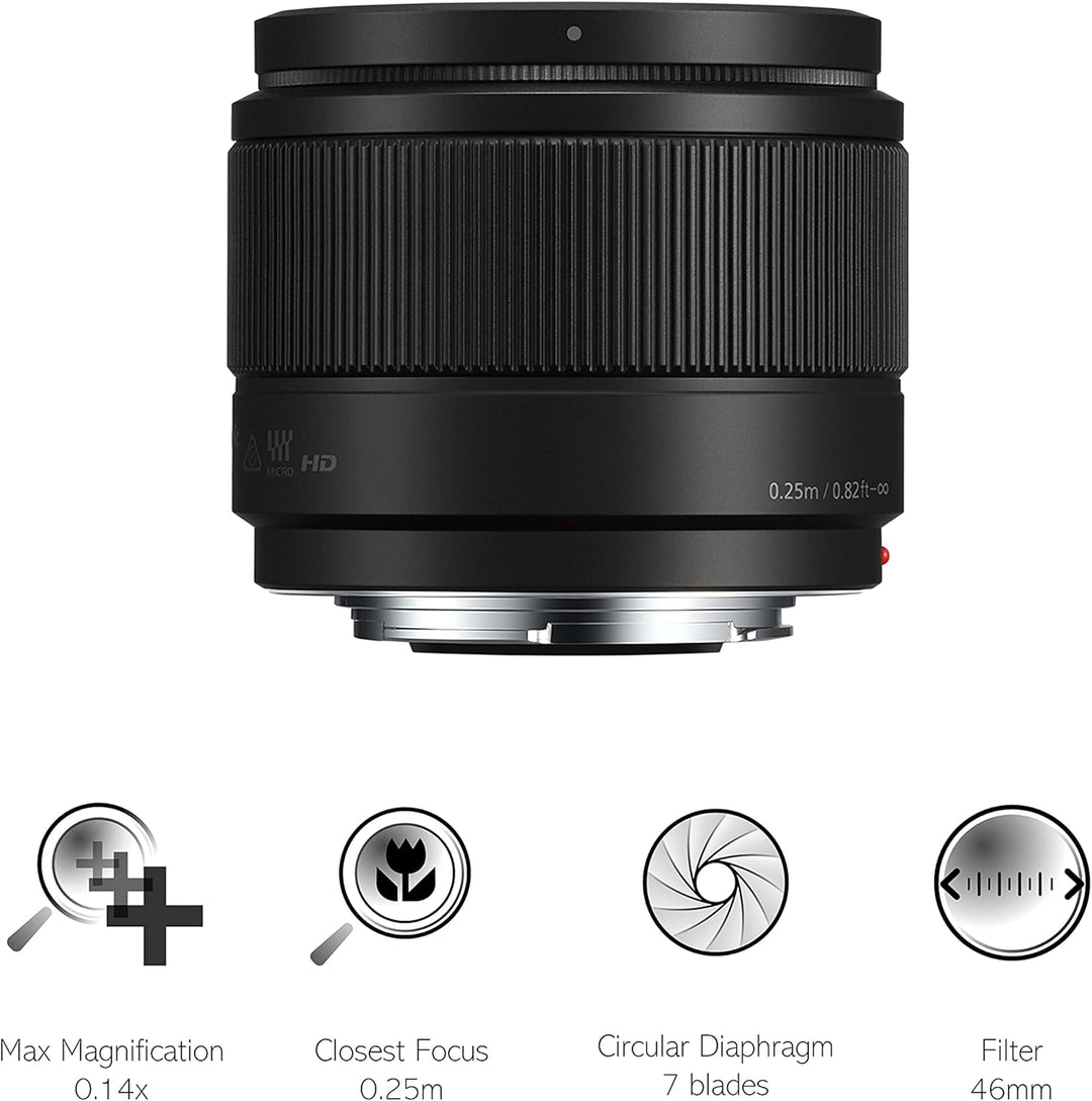 - Zielsetzung Panasonic Lumix G 25 mm F1.7, geeignet für Micro-4/3-Halterungen — 35 mm entspricht: 50 mm. Diagonaler Blickwinkel: 47°