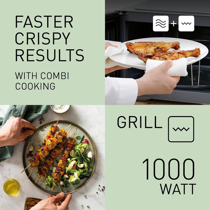 - Schnelleres Kochen: Diese Funktion ermöglicht ein schnelleres Kochen. Durch die Leistung der Mikrowelle können Lebensmittel schnell gekocht werden, während der Grill ihnen eine goldene und knusprige Seite bietet.