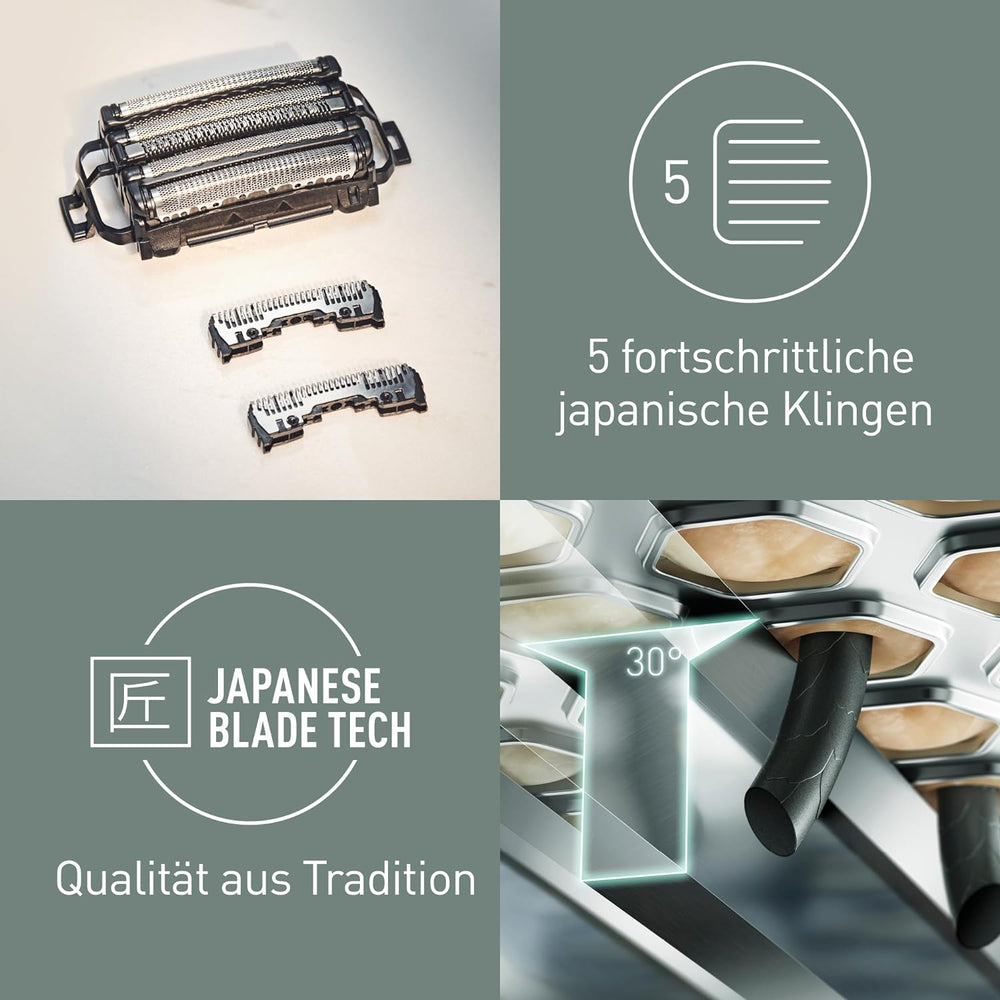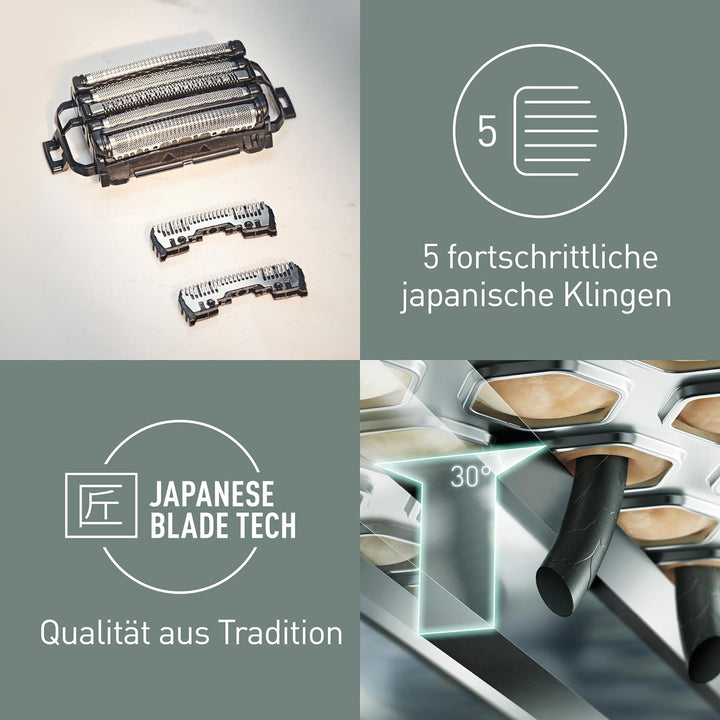 • FORTSCHRITTLICHE KLINGEN: Superscharfe, hochwertige, 30° nanogeschärfte Klingen aus japanischem Edelstahl schneiden durch jeden Haartyp und jede Haarstärke und erfassen mit jedem Zug mehr Haare, für eine schnelle, effiziente und komfortable Rasur