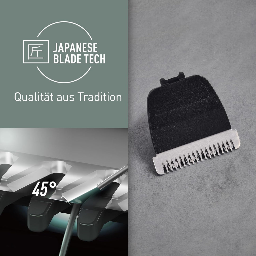 - JAPANISCHE KLINGENTECHNOLOGIE: Die innovative, hochmoderne Klingentechnologie wurde von der Schwertherstellung der japanischen Samurai inspiriert und ermöglicht ein schnelles, effizientes und präzises Schneiden und Trimmen der Haare