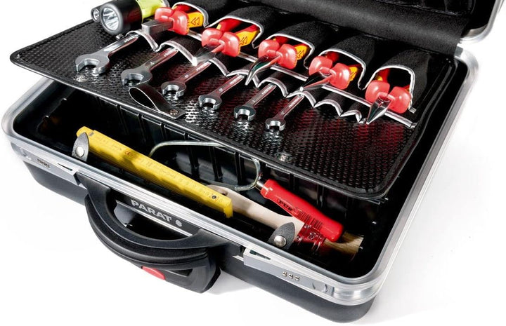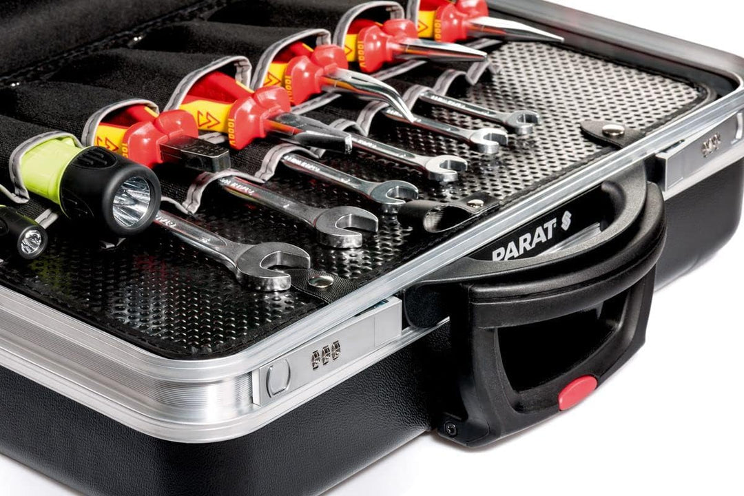 - Der Premium-Werkzeugkoffer verfügt über eine robuste, rutschhemmende X-ABS Aussenschale, welche durch einen umlaufenden Doppelaluminiumrahmen verstärkt und somit bis zu 30 kg belastbar ist.