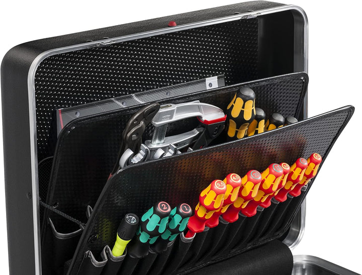 - Insgesamt verfügt der CLASSIC KingSize über zwei Werkzeugtafeln mit genähten Separationen, einer frei unterteilbaren Bodenschale für Kleinteile und der dazugehörenden Abdeckplatte mit weiteren Einsteckfächern
