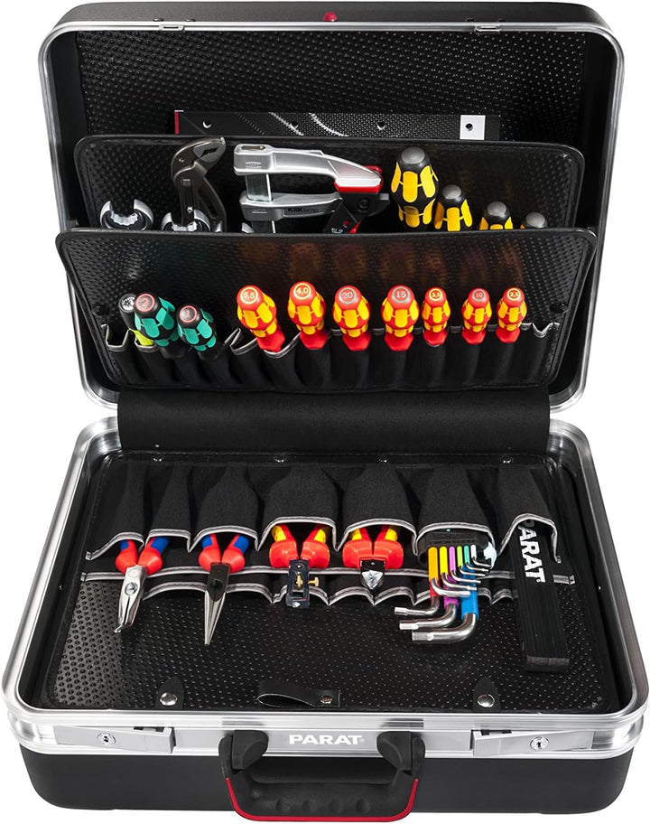 - Der PARAT Premium-Werkzeugkoffer CLASSIC im King-Size-Format fasst insgesamt bis zu 50 Werkzeuge in den dafür vorgesehenen hochwertig genähten Einsteckfächern