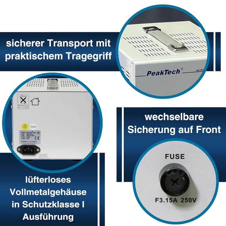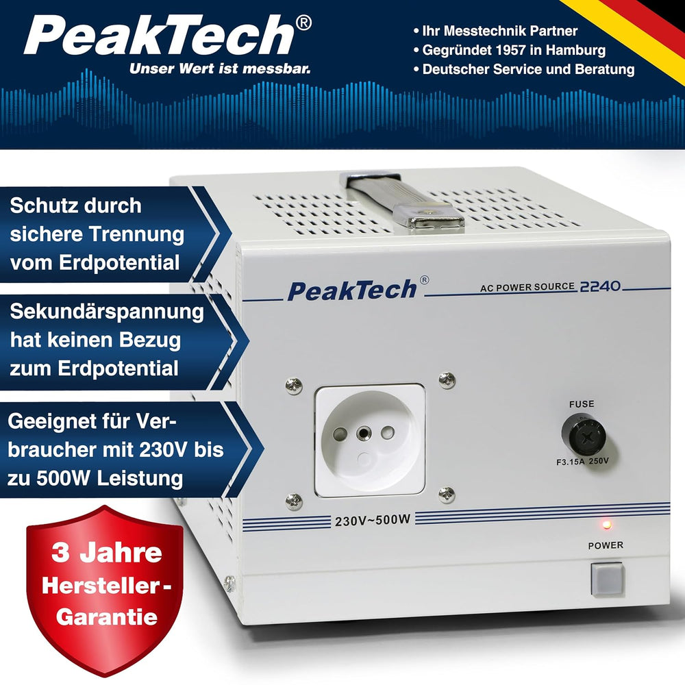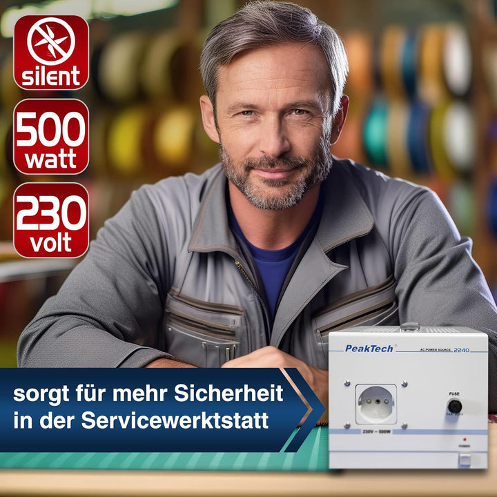 - TRENNTRAFO: Das P 2240 trennt die galvanische Verbindung der Ausgangsspannung zum Stromnetz. Die ausgangsseitige Spannung hat keinen Bezug zum Erdpotential - und sichert gegen elektrische Fehler ab