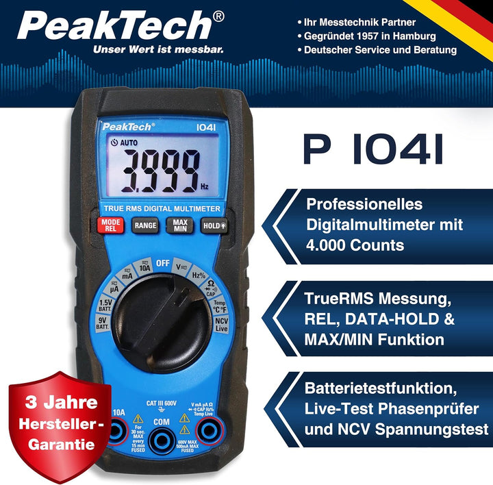 - VIELFÄLTIG EINSETZBAR: Das neue PeakTech 1041 ist ein kompaktes TrueRMS Multimeter im stabilen, doppelt isolierten Gehäuse mit aufgespritzter Gummierung für den sicheren Einsatz im Elektrohandwerk.