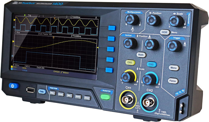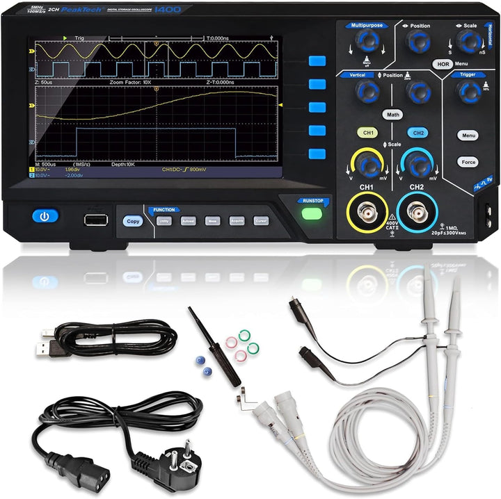 - Produkt 1: Ideal für Hobby und Beruf: 2 - Kanal Oszilloskop mit 5 MHz analoger Bandbreite bei max. 100 MS/s Abtastrate, 10000 Punkte Speichertiefe, 8-Bit A/D Wandler, TFT-Farbdisplay, CAT II 400V