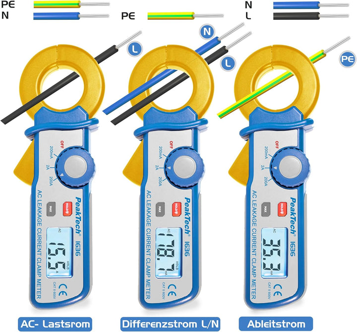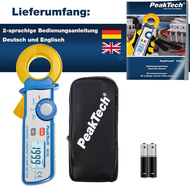 - ERSTE WAHL: Die PeakTech P 1636 Leckstromzange besitzt eine Messauflösung von 100 μA bis 200 mA AC, 1 mA bis 2 A AC und 100 mA bis 200 A. Somit ist sie für Hobby, Handwerk und Industrie ideal geeignet