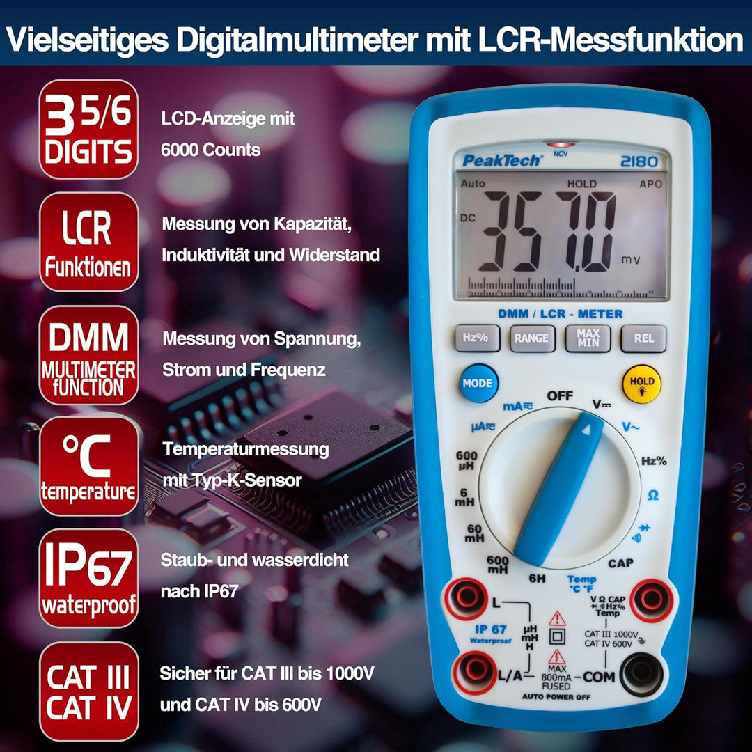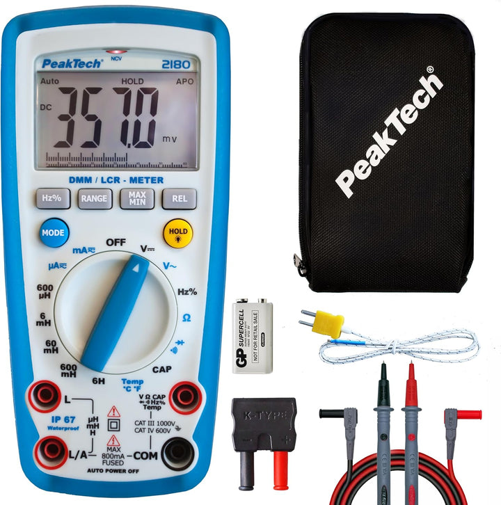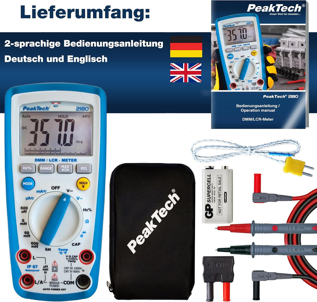 - LEISTUNGSFÄHIGES MESSGERÄT: Das staub- und wassergeschütze LCR-Multimeter P 2180 von PeakTech ist ein vielseitiges Gerät, das sich hervorragend im Service- und Wartungsbereich einsetzen lässt