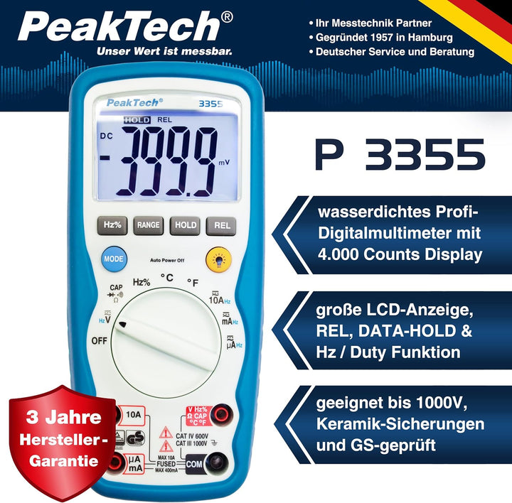 - TRUE RMS MESSGERÄT: Das Digital-Multimeter P 3355 von PeakTech mit REL-DATA HOLD und robustem Kunststoffgehäuse eignet sich perfekt für den Ausbildungs- und Servicebereich sowie für Hobby-Anwender