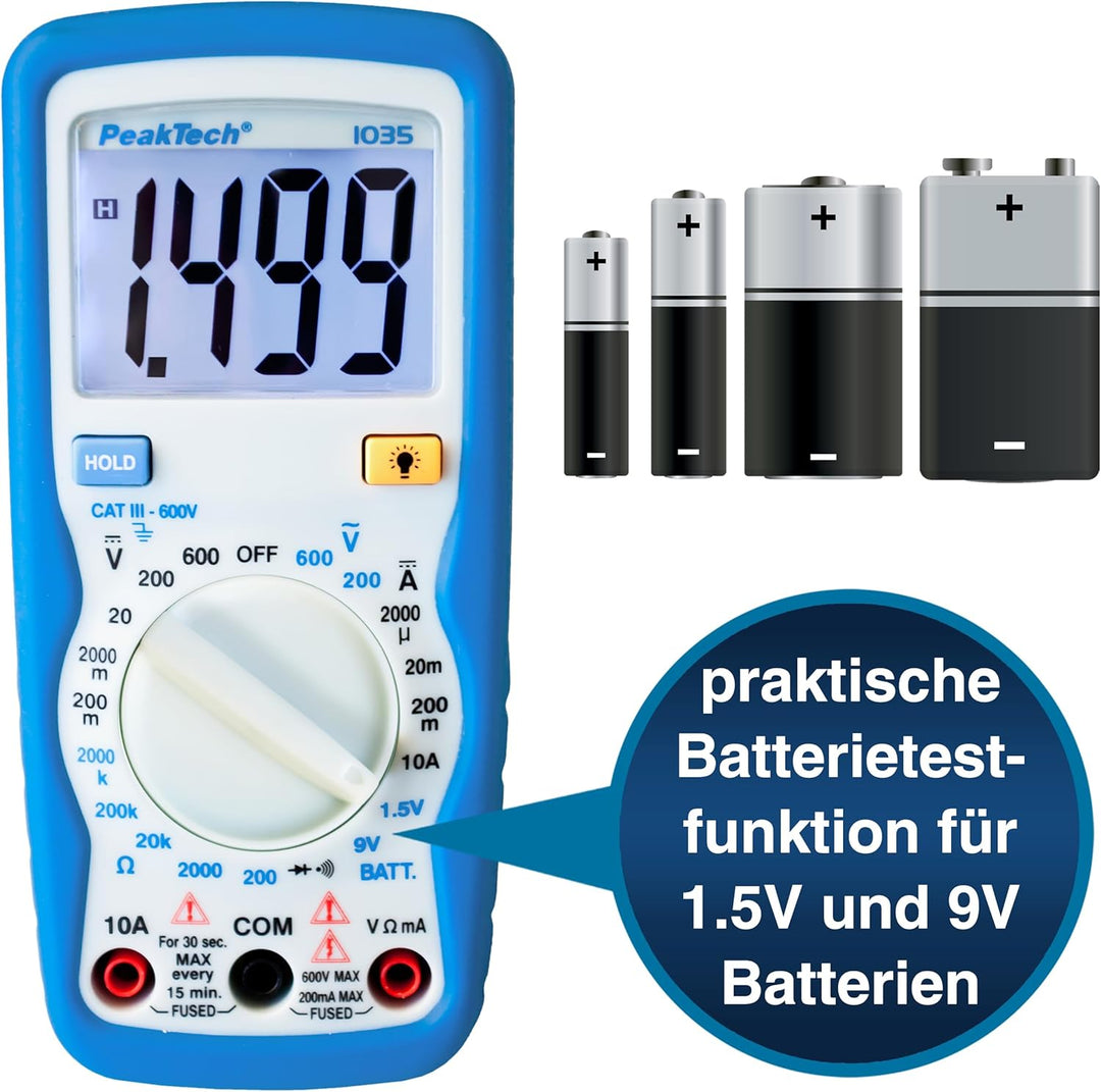 - BATTERIETEST & HOLD-FUNKTION: Die Funktion „Batterietest“ erlaubt ein Überprüfen der Leistung von Akkus uns Batterien (1,5 bis 9 Volt). Die Hold-Funktion ermöglicht das „Einfrieren“ von Messwerten