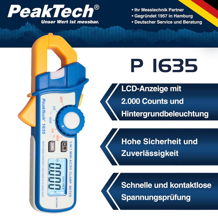 PeakTech P 1635 Stromzange, Kriechstromzange und Leckstromzange, mit 1 mA Auflösung und NCV, 1 Stück