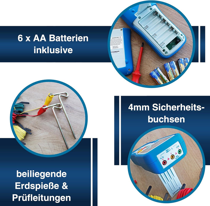 - FEATURES: Der TÜV/ GS-geprüfte Erdungsmesser überzeugt mit einer Vielzahl an Funktionen wie der DATA-Hold-Funktion zum Einfrieren des Messwertes, einer Abschaltautomatik & automatischem Nullabgleich