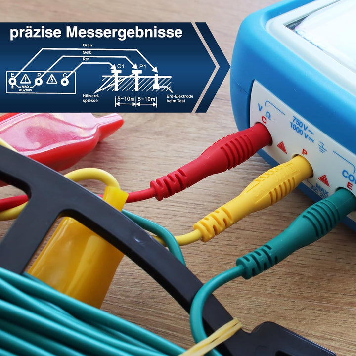 - INFO: EN-61010-1; CAT III 1000 V; 2. 000 Counts; Zubehör: Tasche, Prüfleitungen rot 15 m, gelb 10 m, grün 5 m, 2 x Erdspiesse, Batterien und Bedienungsanleitung. Masse: 92 x 200 x 50 mm, Gewicht: 700 g