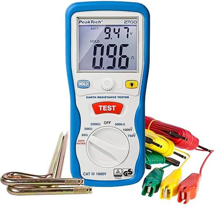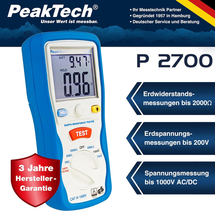 - ERDUNGSMESSER: Das digitale Erdungsmessgerät P 2700 von PeakTech eignet sich für Prüfungen von Erdungseinrichtungen in strombasierten Industrien, Telekommunikationsnetzen & Elektroantriebssystemen