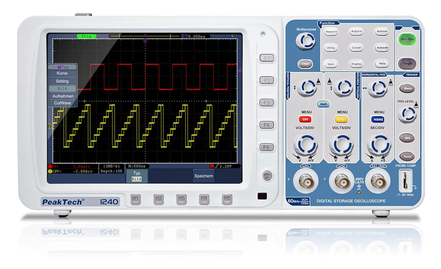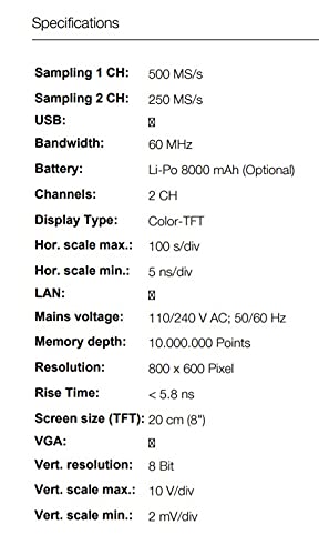 - INFO: EN 61010-1; CAT II; 60MHz Bandbreite (60 Millionen Zyklen / Minute); 2 Kanäle; 800 x 600 Pixel; 8“ TFT-Farbdisplay; 10 Mio. Speicherkapazität/Channel. Masse: 340 x 155 x 70 mm; Gewicht: 1,8 kg